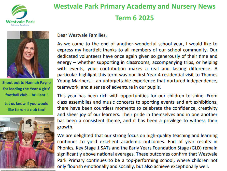 I am delighted to welcome you and your family to Westvale Park Primary Academy School. Our entire team is looking forward to ensuring your child reaches their full potential and thrives during their time here, in close partnership with you at all times. I'm proud to be Headteacher at Westvale Park Primary Academy, which caters for children aged 2–11, including a fully integrated nursery.